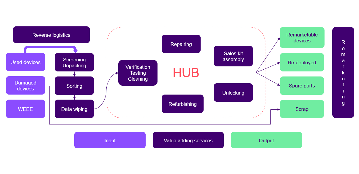 We propose a competitive price and a comprehensive and holistic approach to the disposal of overstock or retired assets. We buy your used or damaged or end-of-life devices and accessories to screen, sort, and test them, perform a full data wipe, and repair as much as possible.